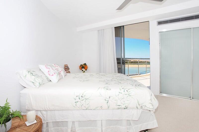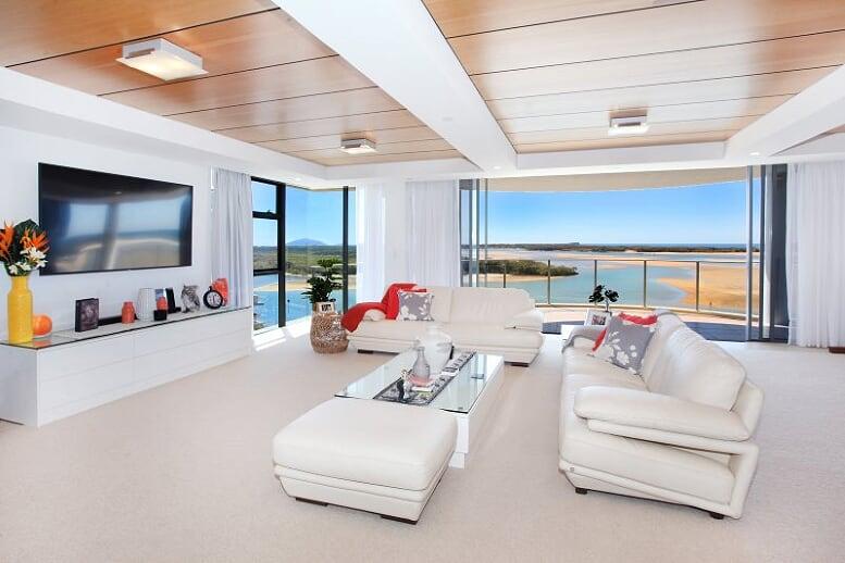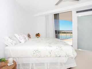 Full height sliding glass provides the preferred northeast aspect towards Maroochy river mouth, Cotton Tree Park.